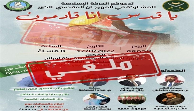 يذكر أن المهرجان، كان من المقرر أن يستضيف عدداً من الشخصيات الوطنية والبرلمانية الأردنية، للتأكيد على وقوف الشعب الأردني مع القضية الفلسطينية، وفي المقدمة منها المسجد الأقصى المبارك.