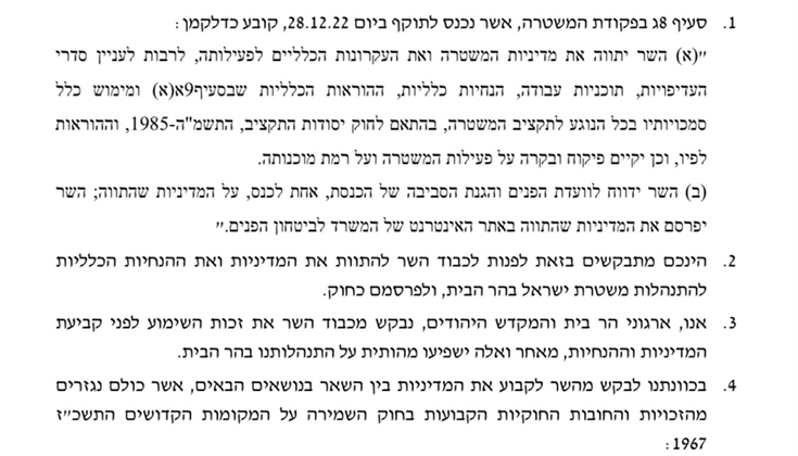 وجه المحامي أفيعاد فيسولي المحامي عن "مجلس السنهدرين الجديد" رسالةً، صباح اليوم الأحد 2023/1/1، إلى مفوض شرطة الاحتلال في القدس، يطلب فيها توضيح السياسة الرسمية التي سيتبعها وزير الأمن القومي الجديد المتطرف إيتمار بن جفير، ويطلب فيها جلسة استماع مباشرة مع الوزير لسماع مطالب تلك الجماعات بشكلٍ واضح ومن ثم تحديد موقف حكومة وشرطة الاحتلال منها، وقد حدد فيسولي تلك المطالب بـ 11، هي: