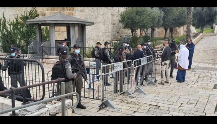 ونصبت سلطات الاحتلال حواجز حديدية على أبواب المسجد الأقصى المبارك، وتحديدَا عند أبواب: الملك فيصل، والغوانمة، والحديد.