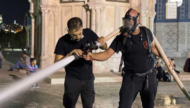 صور .. خلال استكمال رجال الدفاع المدني التابعين لدائرة الأوقاف الاسلامية لتدريباتهم في باحات الأقصى المبارك