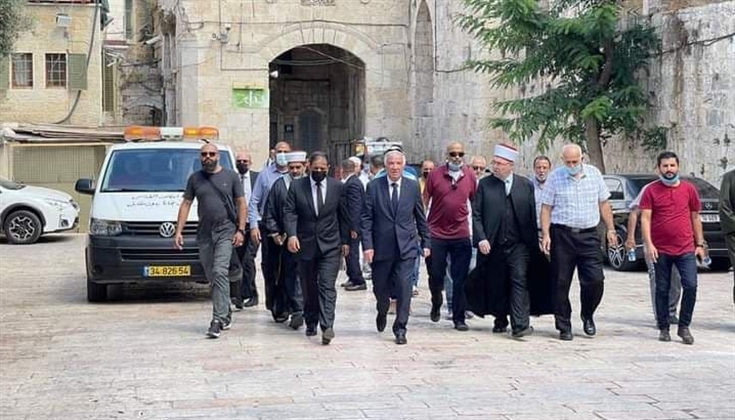 #صورة للوفد الأردني بصحبة وفد من الأوقاف الإسلامية متجهين إلى الأقصى من باب الأسباط وبصحبتهم السيارة التي تقل رفات الجندي.